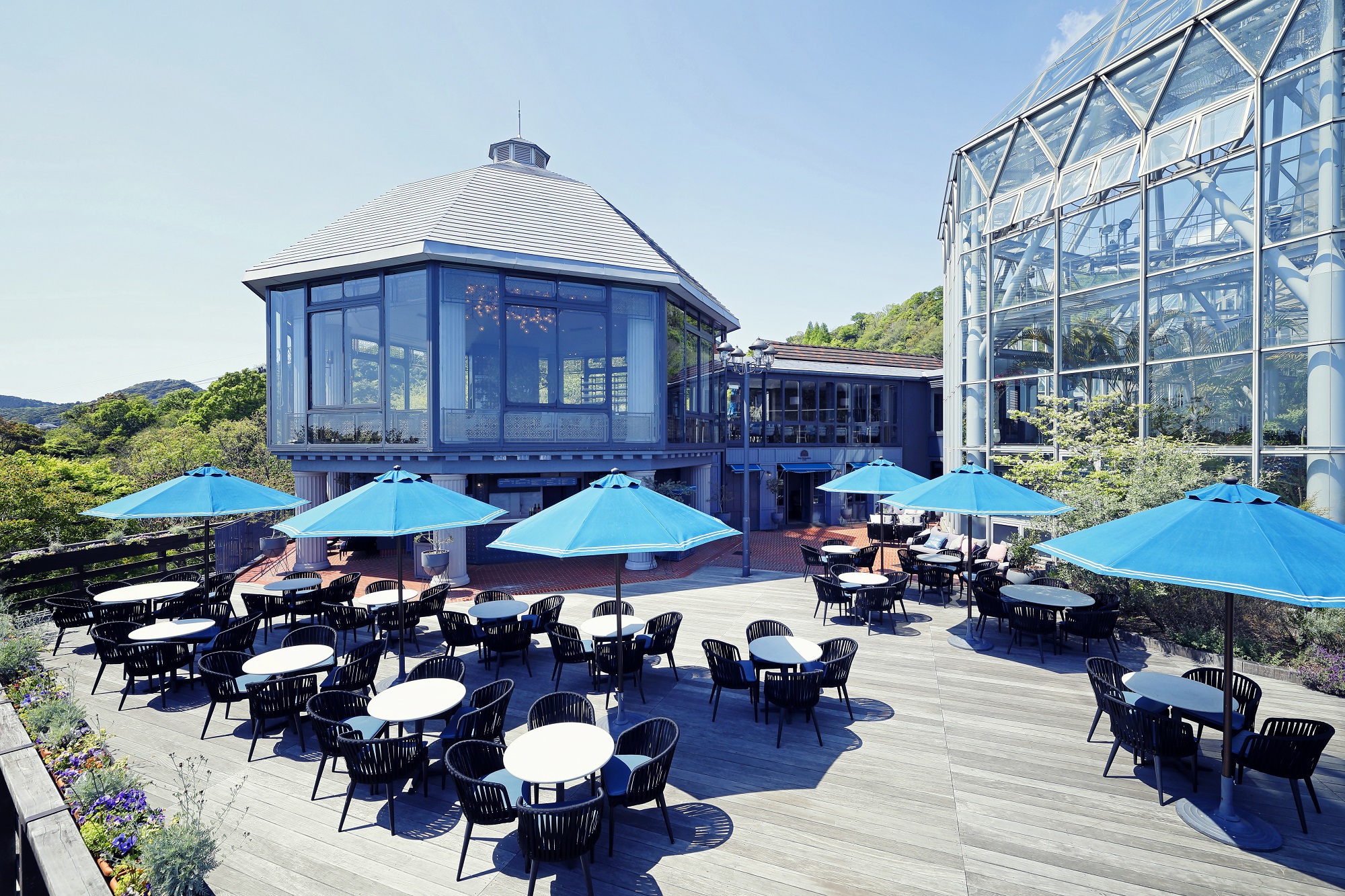 透過玻璃屋或是在露台上望去盡是優美的神戶山海風光,適合在此度過優雅午後!