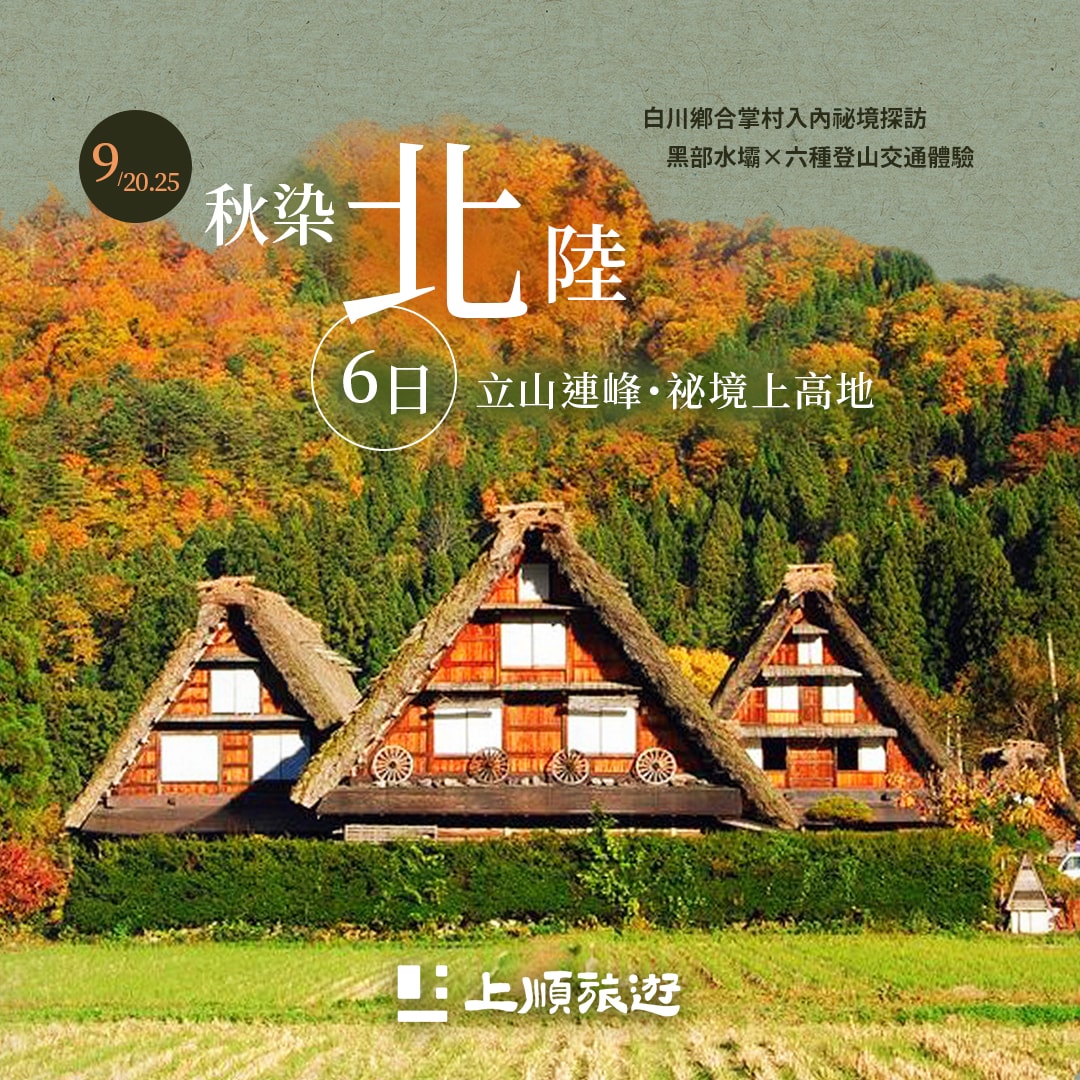 此行的核心,是挑戰有「日本屋脊」之稱的黑部立山,我們將安排搭乘六種交通工具,輕鬆穿越壯觀的阿爾卑斯山脈路線 。行程更囊括了有「神的故鄉」美譽的祕境上高地 、世界遺產白川鄉合掌村 ,以及日本三大名園之一的金澤兼六園 ,是一趟完整收錄北陸秋季精華的深度之旅。