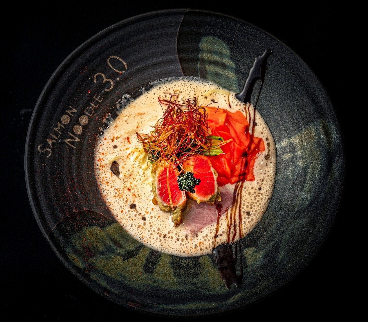 為了保有極致的口感,在處理食材的技法上,「鮭魚noodle3.0」是使用分子調理器來抑制水分流失以保留食材本身的湯汁,還利用一氧化二氮將食材打成泡沫狀以帶出法式料理的高級口感。人氣招牌菜色「白鮭魚拉麵」受到許多饕客的推崇,軟嫩多汁的鮭魚保有的適中鹹度,搭配帶有自然甜味的蘿蔔泡沫,層次豐富的嶄新吃法顛覆了所有人對於拉麵的既有概念。