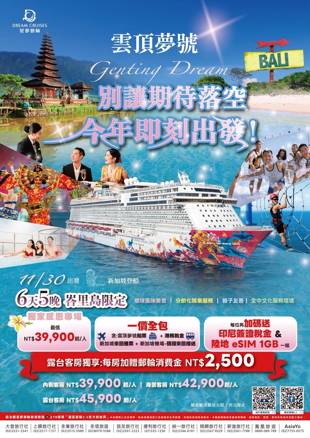 您是否也將峇里島放在夢想清單上,卻總是被繁雜的計畫耽擱?現在,別讓期待再次落空!雲頂夢號隆重推出11/30獨家限定航次,帶您從新加坡啟航,直達眾神之島 — 峇里島!