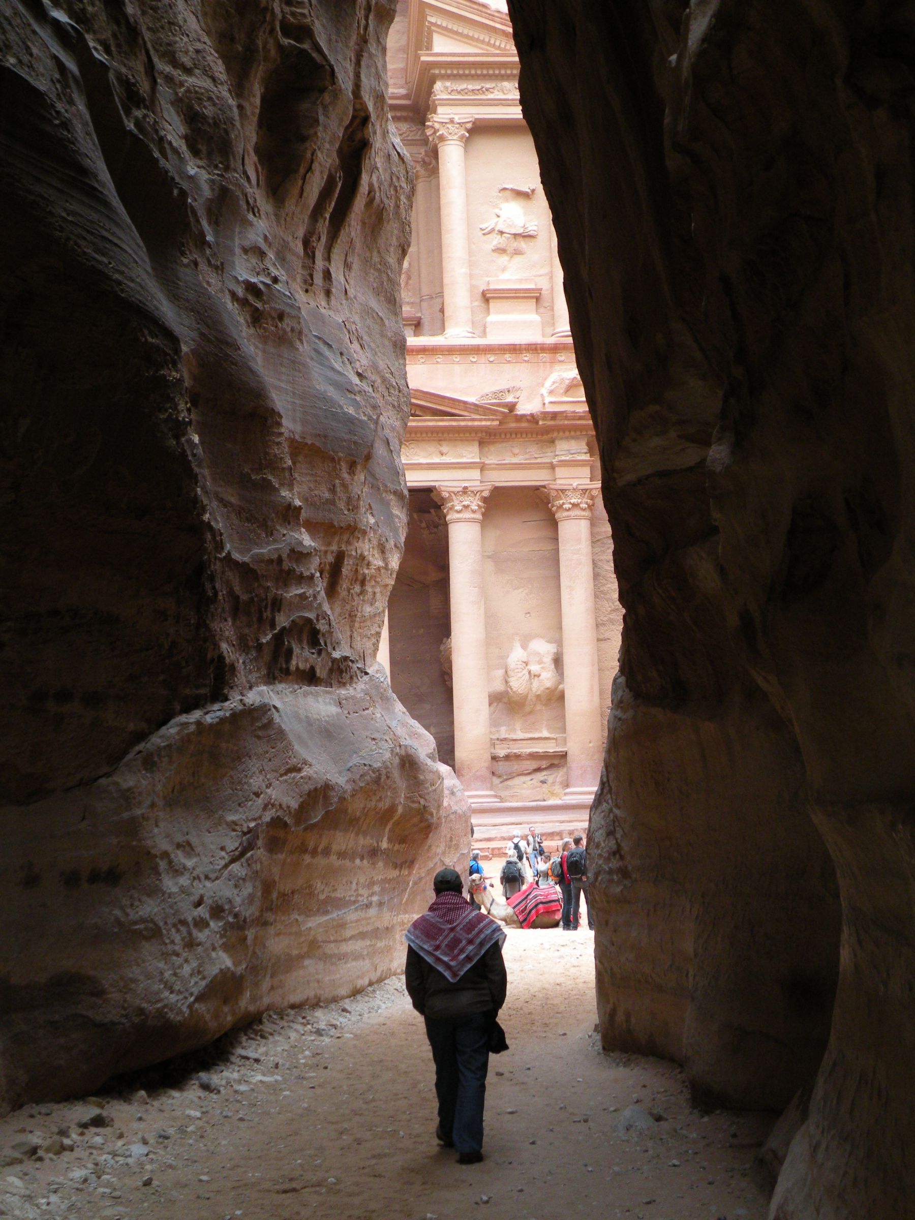 由於整座城市深藏在岩石山谷內,進城必須通過狹長彎曲76 公尺高的砂岩狹縫峽谷,被稱為 Siq,又名”蛇道”,走過峽谷竟盡頭的石縫間,忽然出現一座希臘與埃及混和樣式的神殿. 這是最富戲劇性驚嘆的一刻!