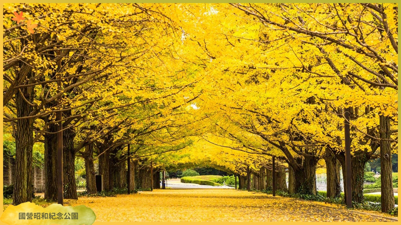 位於立川市,佔地廣闊,園內有多樣化的植物景觀。秋季時,除了火紅的楓葉,由近百株銀杏樹組成的「銀杏大道」更是必訪。最佳觀賞期約在11月上旬至11月下旬,非常適合騎乘自行車或漫步其中,享受被金黃色調包圍的浪漫氛圍。從JR立川站步行即可抵達。