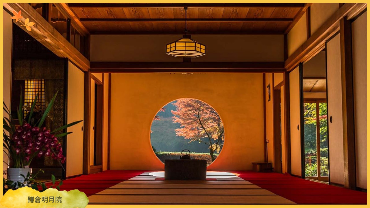 素有「紫陽花寺」之稱,秋季的紅葉景色同樣令人驚豔。最佳賞楓期約在10月下旬至12月上旬,透過圓形窗戶欣賞庭園內的楓紅,充滿禪意。從東京搭乘JR橫須賀線至鎌倉站,再轉乘巴士或江之電即可抵達。