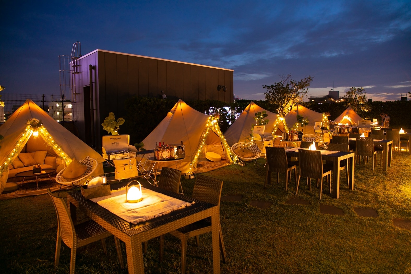 兩處可以體驗奢華露營的場地,分別位於東京晴空街道West Yard的5樓Farm Garden以及East Yard的8樓Dome Garden。營地上設置了擁有防雨功能的帳篷,讓人在雨天也可以輕鬆體驗露營,目前每個帳篷最多可以容納10人。