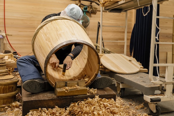 然而,菊正宗酒造美味的秘密在於其使用的「酒樽」,為維護品質不使用鐵釘及任何化學黏著劑,完全以木頭及竹版製作的酒樽製作技術,可在附設的「樽酒 MEISTER FACTORY」近距離參觀酒樽職人精湛的技術。
