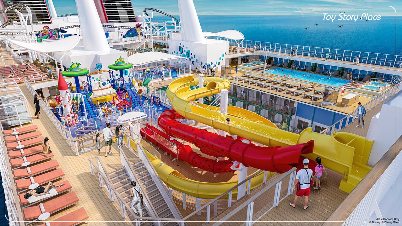 - Toy Story Place:這個充滿活力的水上樂園,以《玩具總動員》系列電影為主題,打造了色彩繽紛的滑水道、互動戲水區及家庭泳池。在陽光下,這裡不僅是孩子們盡情玩樂的天堂,還有兩座巨型螢幕全天候播放迪士尼電影,讓歡樂氣氛隨時瀰漫。