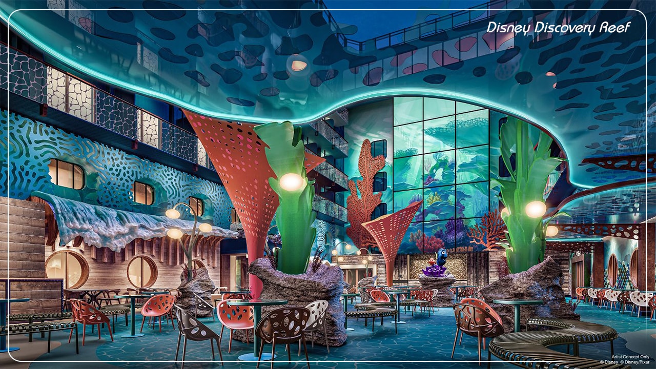 - Disney Discovery Reef:靈感源自《小美人魚》、《海底總動員》和《星際寶貝》等經典海洋動畫,這個區域充滿夢幻的水下氛圍。旅客可以在此享受精緻餐點,並與電影中的角色一同遨遊於虛擬的海洋世界,體驗身歷其境的樂趣。