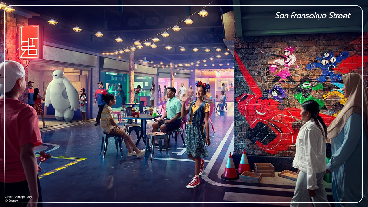 - San Fransokyo Street:以迪士尼電影《大英雄天團》為藍本,這個區域融合了東京的活力與舊金山的氛圍,提供互動遊戲、商店、電影院,以及以電影角色為靈感的娛樂設施,為青少年和家庭打造了一個充滿樂趣的娛樂空間。