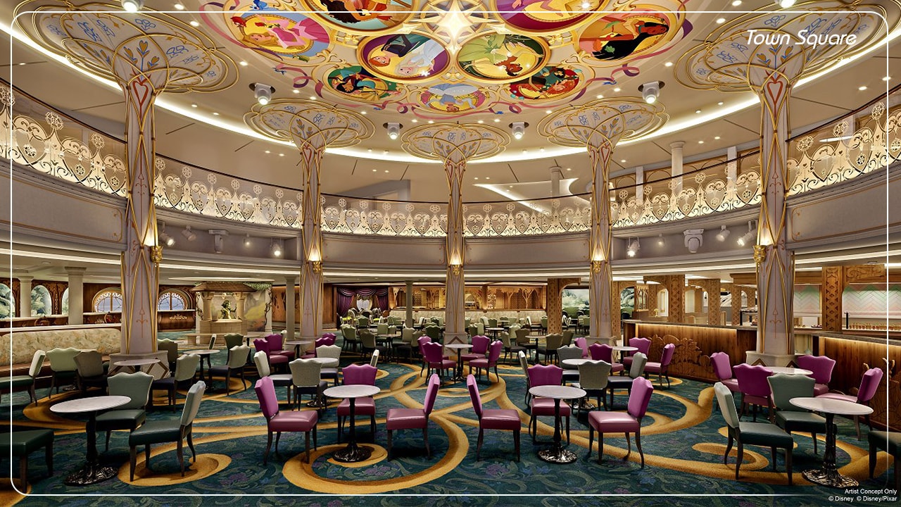 - Town Square:向迪士尼的公主們致敬,此區域以《魔髮奇緣》、《灰姑娘》、《冰雪奇緣》等經典童話為靈感,規劃出一個三層樓高的魔幻空間。這裡不僅有百老匯風格的音樂劇表演,還有各式商店、酒吧、咖啡廳和餐廳,讓您沉浸在皇室般的夢幻氛圍中。