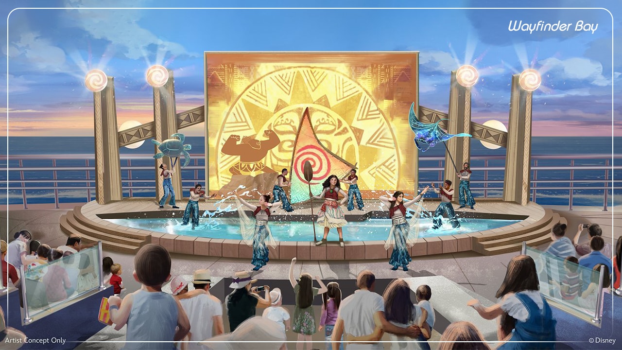 - Wayfinder Bay:靈感來自《海洋奇緣》,這片寧靜的池畔綠洲,提供了一個放鬆身心的完美場所。沐浴在太平洋島嶼的陽光下,享受悠閒的池畔時光,這裡同時也是一個開放式舞台,經常上演精彩的現場表演和互動節目。