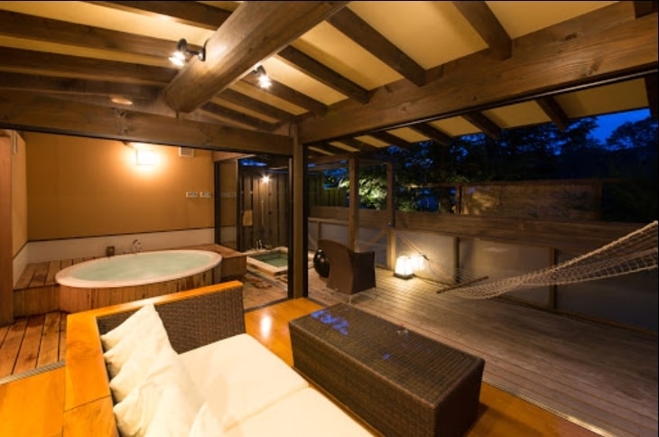 客房內均配有獨立的露天溫泉設施,坐在房內便可聽到從陽台上傳來溫泉的流水聲,氛圍寧靜而安逸。