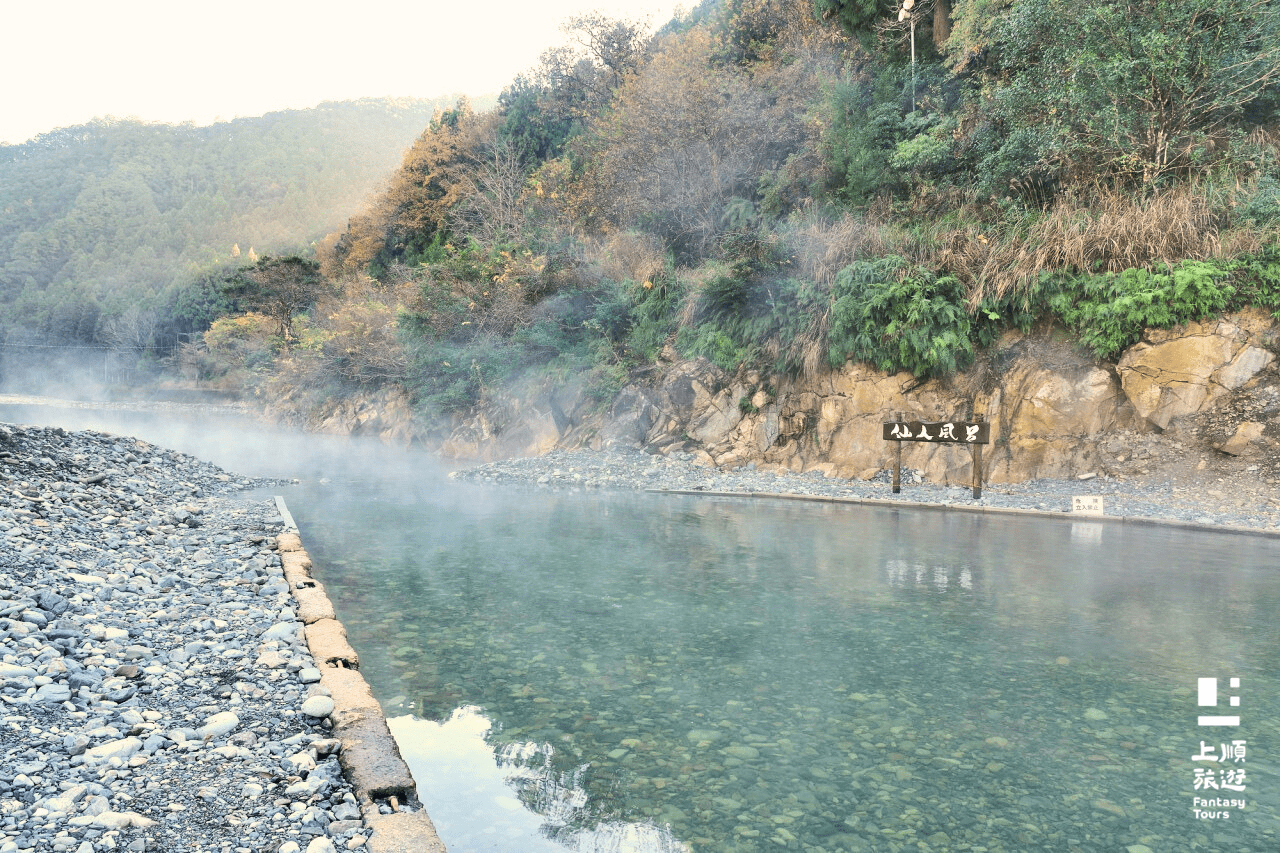 自古便是人們前往熊野參拜之前或之後,在這裡洗去身上污垢和消除長途旅行疲勞的「湯垢離」場。這個古老的溫泉鄉小而安靜,四村川的支流湯之谷川潺潺流過,旅館和民宿隔著湯之谷川一字排開,溫泉蒸氣從河中升起,散發著淡淡的硫磺味,至今仍然保持著古時候的溫泉情緒!