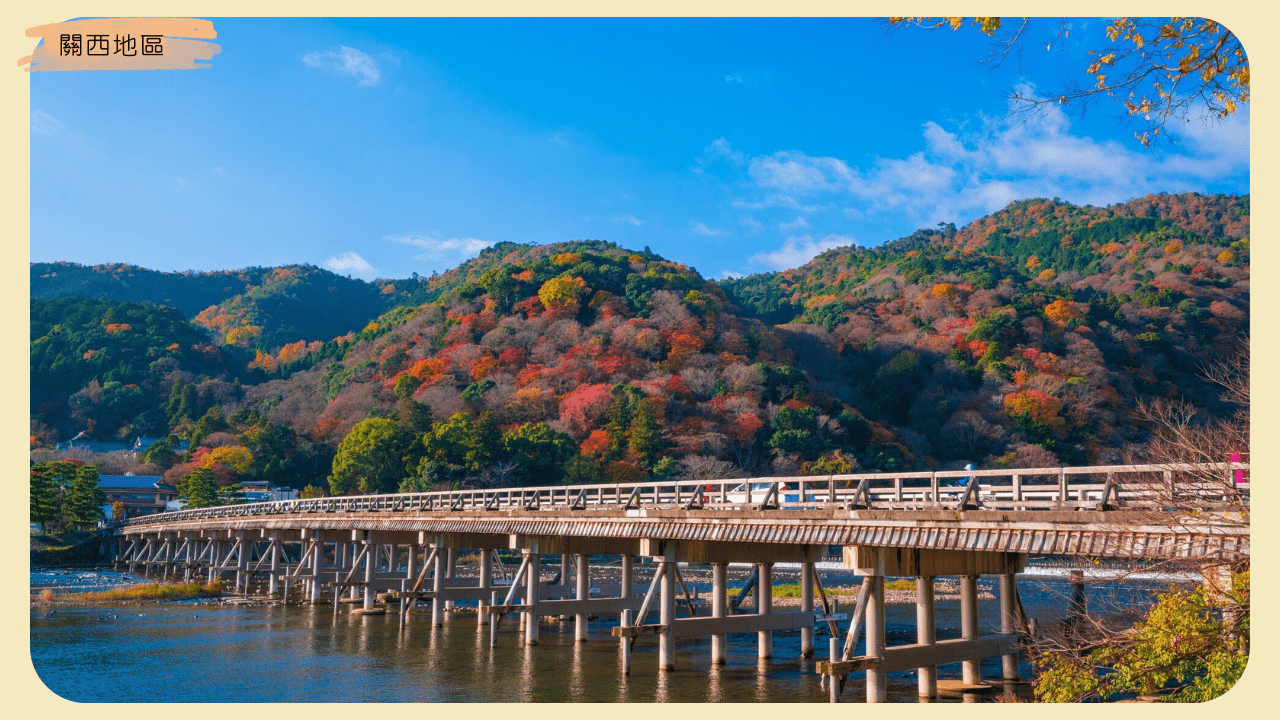 - 景色特色:嵐山渡月橋周邊楓紅滿山,可搭乘嵯峨野小火車欣賞保津峽峽谷楓景;清水寺的夜間點燈活動,讓古寺與楓紅在燈光下交織出迷人景緻。