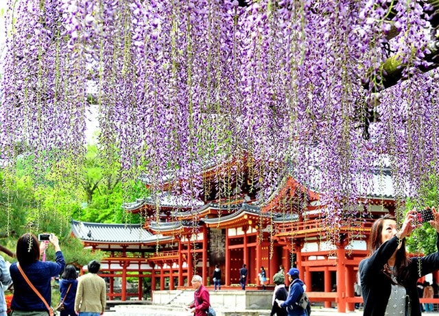 平等院是位於日本京都府宇治市的世界文化遺產,每年四月底到五月上旬是紫藤花盛開的季節。在這段期間,你可以欣賞到紫藤花與鳳凰堂相互輝映的美景。此外,平等院還以推定樹齡250年的紫藤聞名,是關西地區著名的紫藤勝地。