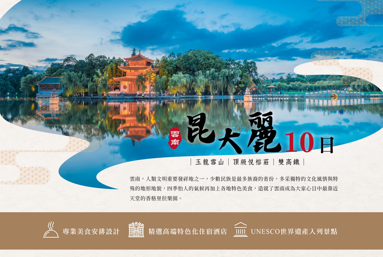 您的旅程將會走訪雲南最經典的風光:深入「天下第一奇觀」石林、在大理古城感受風花雪月、搭乘大索道登頂玉龍雪山,並欣賞張藝謀執導的《印象麗江》實景大秀。全程搭配舒適的雙高鐵接駁與特色美食,讓您以最從容、最尊榮的方式,收藏七彩雲南的雋永之美。