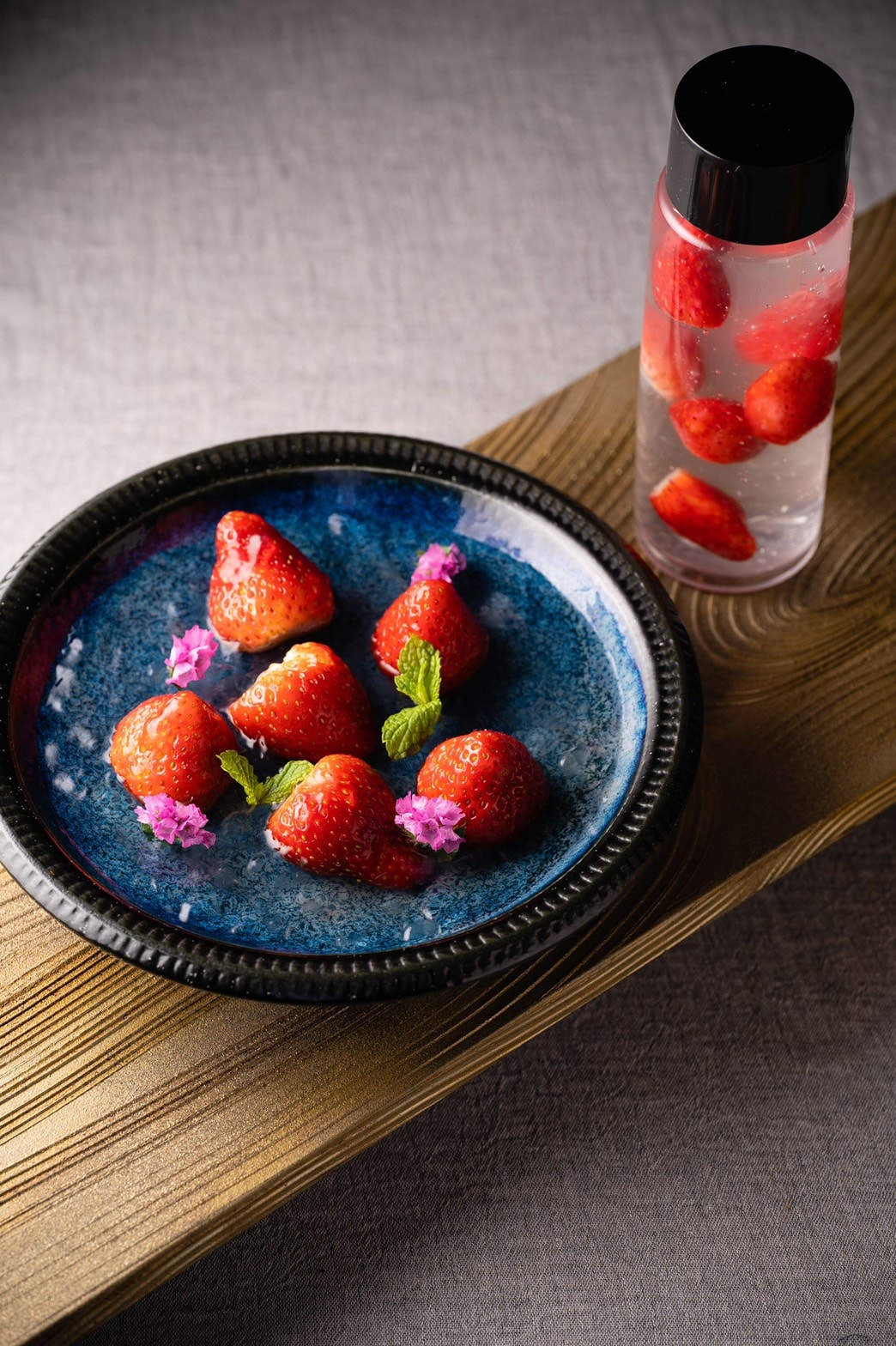 宛若玻璃般透明姿態的「硝子寒天」,則是直接將當季水果放入帶有微微白葡萄香氣的和風果凍之內,如此優雅美麗的呈現直讓人不忍將它吃下肚。