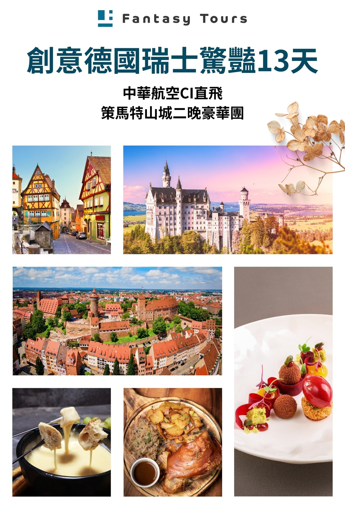 如果您夢想一次收藏歐洲的浪漫古堡與壯麗雪峰,這趟旅程將是您的完美解答。搭乘中華航空直飛法蘭克福,省去轉機勞頓,優雅開啟旅程。