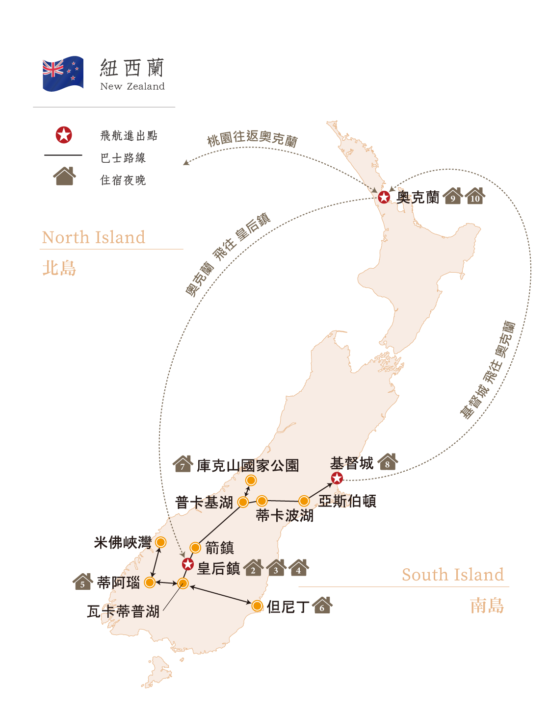 早餐後,即前往奧克蘭機場,搭乘紐西蘭航空班機飛返台灣,下午抵達台灣,帶著滿滿的回憶與團員互道珍重再見後,各自平安返回溫暖的家,結束難忘又精彩的紐西蘭慢遊之旅。
