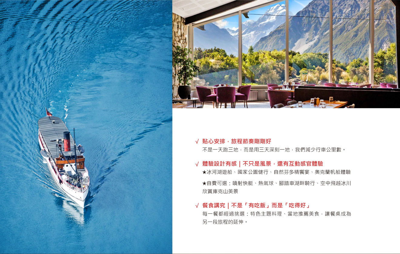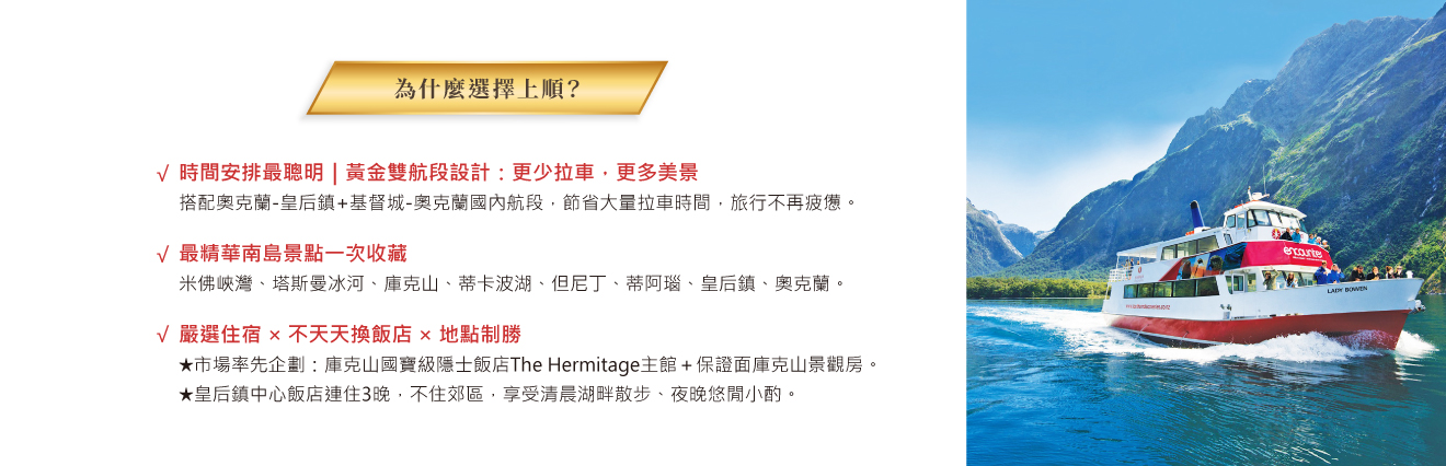 市場上多數行程皆安排走到西海岸,但對於台灣旅客而言,生活在這四周環海的台灣,已經對海岸線景色不陌生,如特別安排拉車到西海岸需要多花660公里,開車沿路不停車需耗時8小時,舟車勞頓卻又不能親近冰川,只能於冰河前緣走碎石子路遠眺冰川(因為西海岸冰川已於2014年中無法再安排半日冰河上健行,因安全性考量僅剩可乘坐直升機上冰川)。又如安排直升機至冰川上健行,也會容易受到天氣情況而影響是否能夠安排健行活動。若只在西海岸停留兩天一夜不建議特別拉車過去,當地住宿環境也限,優質飯店在旺季時分更是一房難求,耗時且旅客沒辦法享受到旅行的悠閒,徒增勞累感。上順堅持安排南島中段精華路線基督城─庫克山─瓦納卡─蒂阿瑙,再到皇后鎮,讓您輕鬆慢遊享受最優質的紐西蘭旅遊!