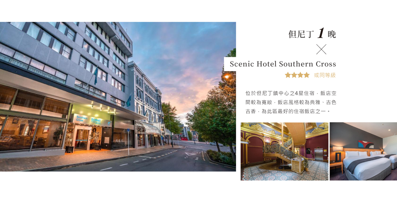住宿:Distinction Luxmore Hotel 或 Scenic Hotel Southern Cross 或同等級