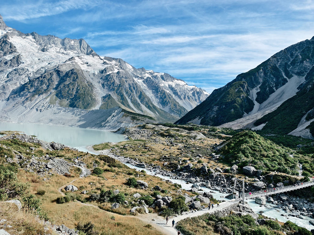 今日深入庫克山國家公園,欣賞巍峨雪峰與壯麗冰川。您可依體力選擇適合的步道,挑戰庫克山健行之旅!近在咫尺的庫克山與慕勒冰河壯觀景象,一覽山脈冰川的壯闊景緻,將是您最佳獎勵。