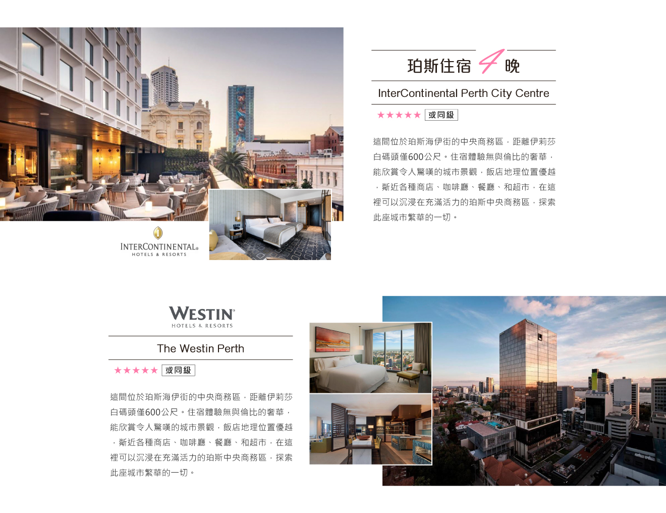 特別安排於珀斯市中心內4星級以上飯店,並連續入住4晚,無需每晚打包行李,讓您的旅程更加輕鬆、便利。