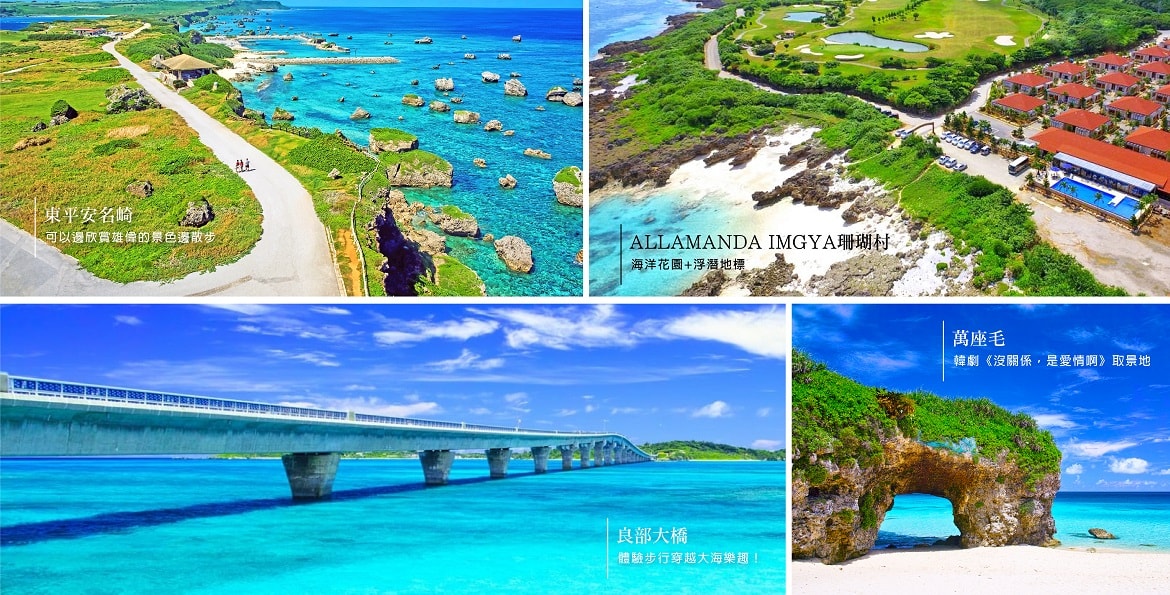 渡口之濱海灘─ 伊良部島最著名的沙灘,彎彎長長的弓狀,細白的沙是由珊瑚形成,海水純淨透明,任何角度都是迷人的畫面;還可以眺望宮古島及來間島。