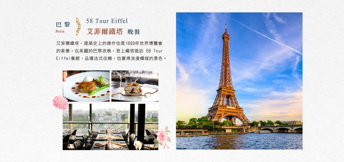 晚餐:特別安排著名和平咖啡館法式惜別晚宴或艾菲爾鐵塔晚餐58 Tour Eiffel