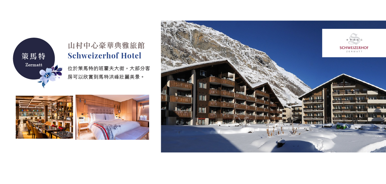 住宿:National Zermatt 或 策馬特 Schweizerhof Hotel 或 策馬特 Christiania Mountain & Spa 或 Alex Zermatt 或 SCHLOSS Zermatt - Active & CBD Spa Hotel 或 山村豪華四星級同級旅館