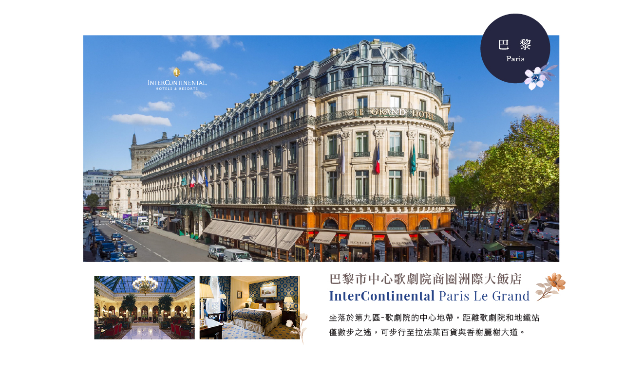 (2)本行程可以將團體機票更改為個人票,巴黎可以續住、延長旅遊天數,相關價差請洽業務承辦人員。