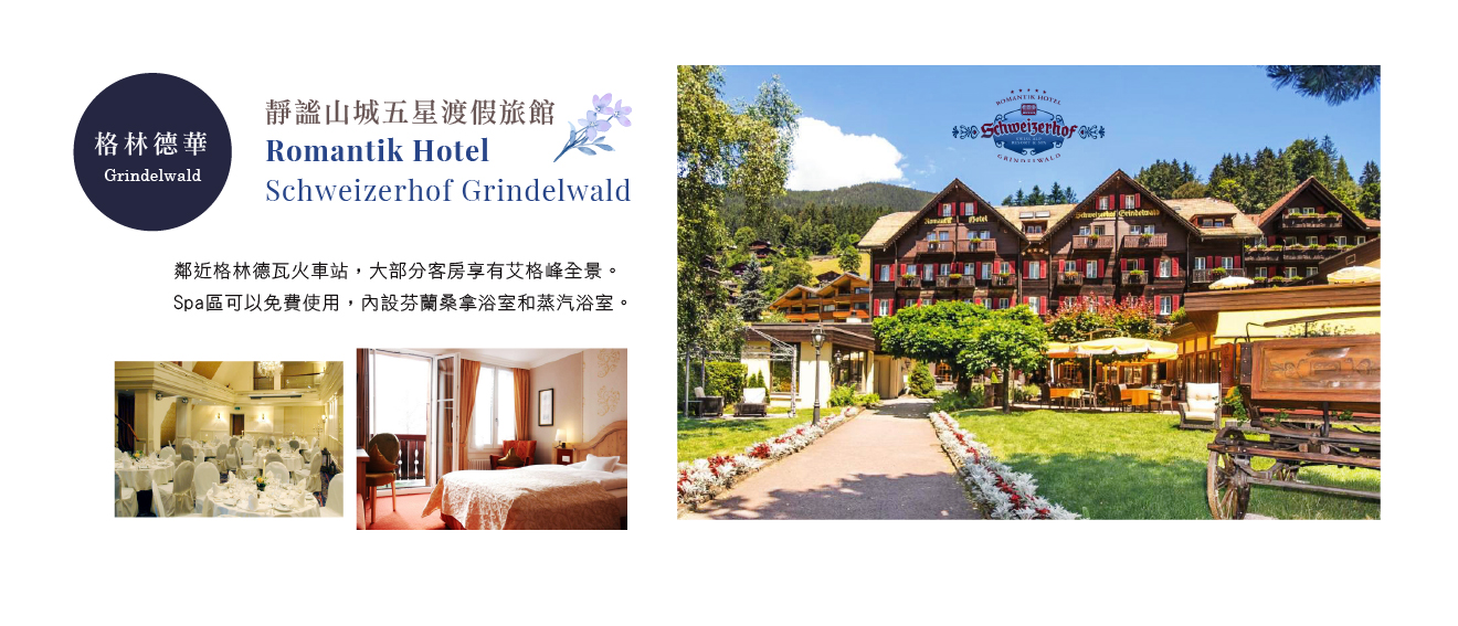 住宿:Eiger Selfness 或 Hôtel & Apartments Kirchbühl Hôtel & Apartments Kirchbühl 或 Romantik Schweizerhof 或 Sun Star 或 格林德瓦 Hotel Belvedere Grindelwald 或 鄰近山村四星級旅館