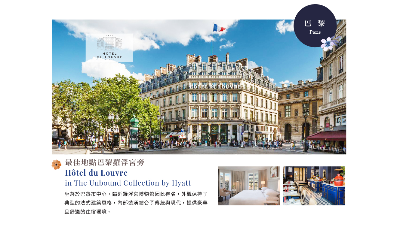 住宿:Hôtel du Louvre Collection by Hyatt 或 Intercontinental Le Grand 或 Kimpton St Honoré Paris by IHG 或 SO Paris Hotel 或同等級