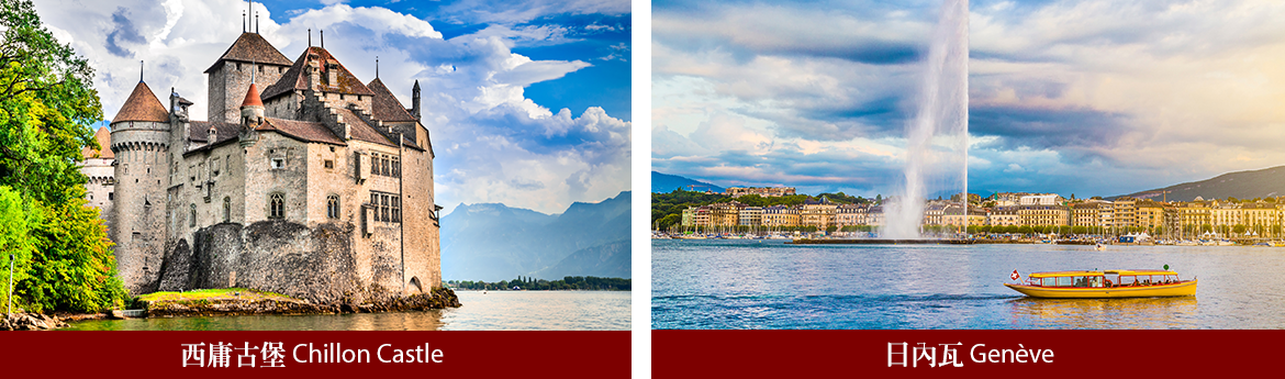 ★西庸古堡,位於蕾夢湖畔青山綠水之間,文人墨客多詠的古堡,真正建築年代已不可考,規模不大,但石材加上原木的建築反而突顯其中世紀質樸的風貌,配著山光水色的外在環境,格外迷人;城堡內的中世紀古蹟相當豐富,包括防禦塔樓、軍火庫、公爵居所、紋章大廳、禮拜堂等,地下室設有牢不可破的監獄,1530年至1536年間,日內瓦獨立主義者法朗索瓦博尼瓦(François Bonivard),他是聖維克多隱修院院長曾被囚禁在此,後來英國詩人拜倫(Lord Byron)寫成了著名長詩《西庸的囚徒》,歌頌自由,城堡因此聲名大噪,吸引不少遊客前來。■日內瓦,位在瑞、法邊境的這裏是全瑞士最國際化的城市,至少有近300個國際性機構在此,如聯合國歐洲總部、紅十字會及世界衛生組織…等,更提昇了其國際都市地位;暢遊位於蕾夢湖畔旁■英國花園、花鐘廣場、大噴泉。