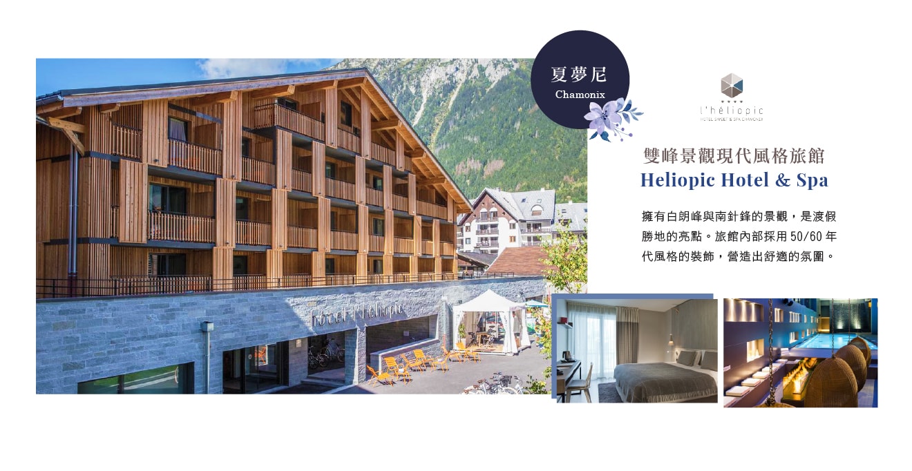 住宿:Alpina Eclectic Alpina Eclectic 或 Boutique Le Morgane 或 夏夢尼L’Heliopic Sweet &SPA 或 Chalet Hôtel le Prieuré & Spa 或同等級
