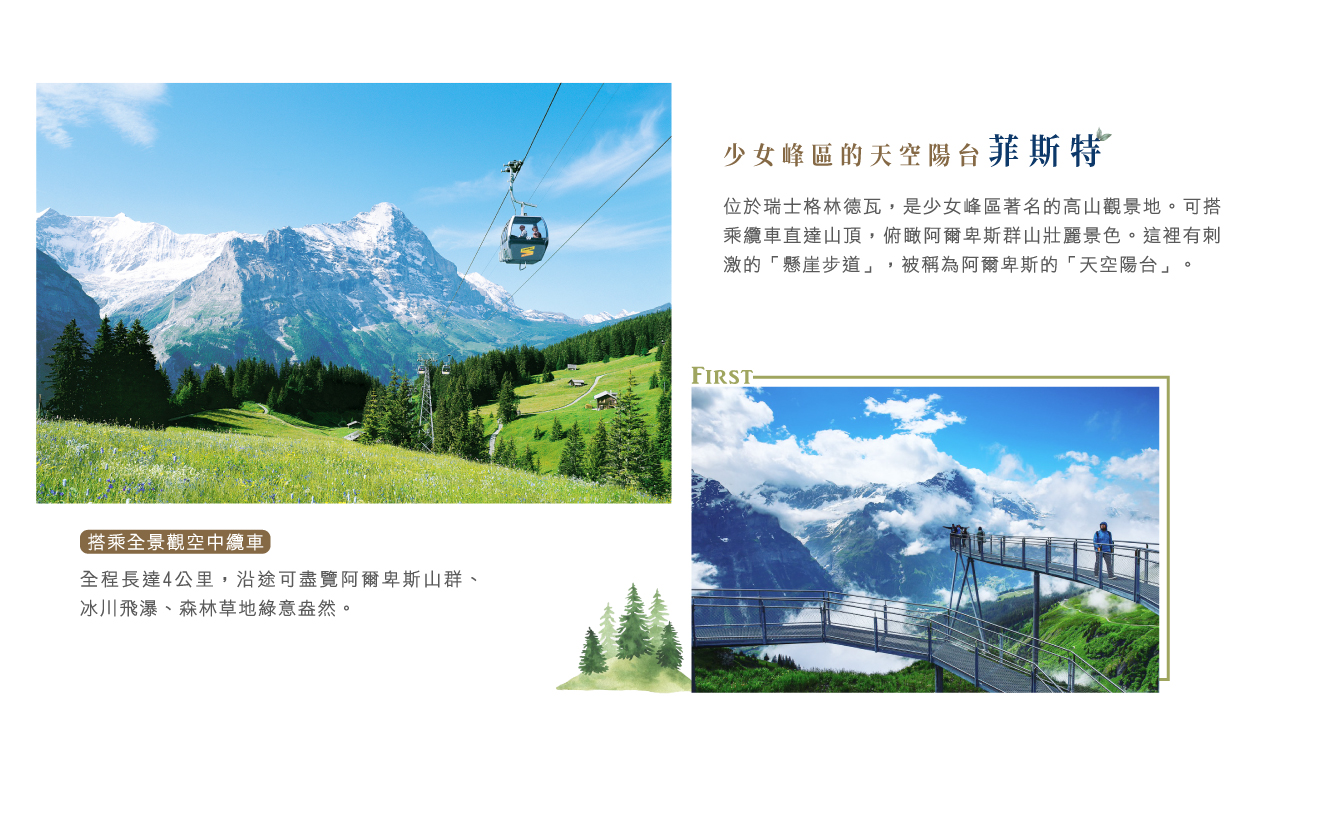 ◆菲斯特全景觀空中纜車,全程長達4公里,沿途可盡覽阿爾卑斯山群、冰川飛瀑、森林草地綠意盎然,約莫20多分鐘即達抵2,171米高的瞭望台,欣賞少女峰群~威特洪峰、雪瑞克洪峰及險峻的艾格峰北側,震撼美景彷彿近在眼前;沿著山壁新建了一座懸崖步道,其中包含一段長約40公尺的天空步道和吊橋,以及一座面向艾格峰、長約45公尺的觀景步道,可將周圍山景一覽無遺,也兼具驚險刺激的難得體驗;也可沿著起伏平緩的◆山區步道(單程約1小時,適合所有遊客)輕鬆行至海拔2,265米的高山湖泊~巴克普湖,有如完美無瑕的珍珠,閃耀在群山之間,一賞靜謐的湖面倒映著白雪暟暟的環山景致,此等美景令人相當難忘。