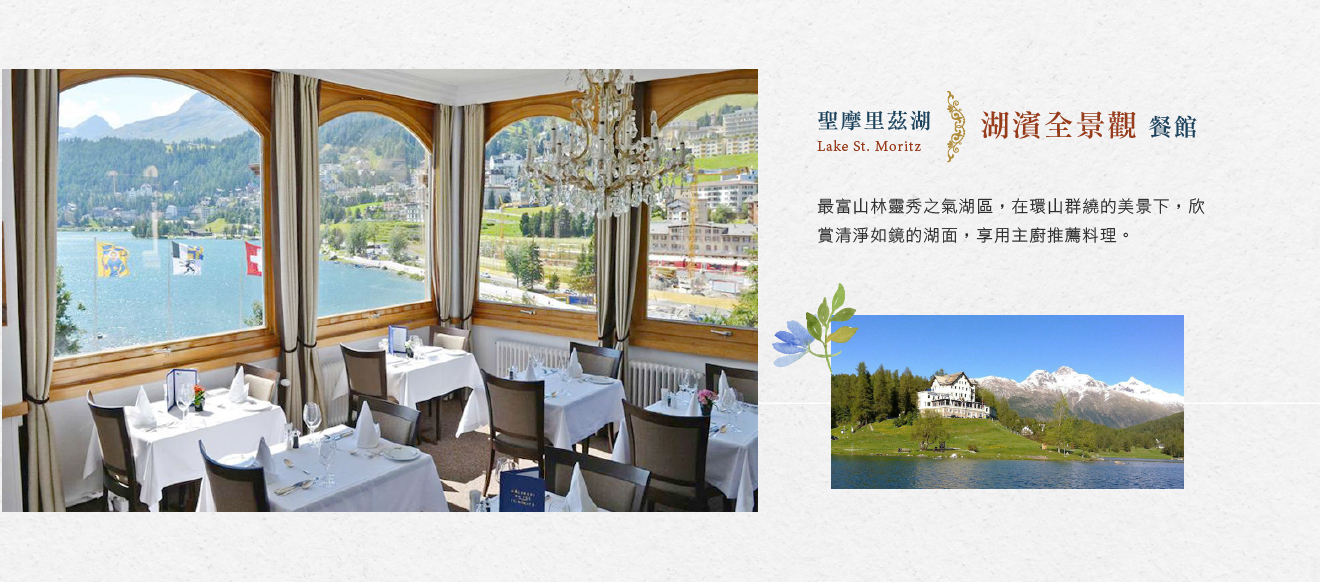 ■聖摩里茲湖,經風景秀麗的高山隘口,前往甚受世人喜愛的渡假勝地聖摩里茲,是最富山林靈秀之氣湖區,座落瑞士東部標高1768公尺,晴朗而乾爽的氣候,博得了「香檳天氣」的美稱,優越的地理位置、環山群繞的獨特美景、澄清如鏡的湖面、秀雅之氣的寧靜山村,構成一幅大自然風景畫。夏令時節百花齊放清風吹拂、冬令期間山頭白雪靄靄宛若人間仙境,吸引無數歐洲皇室貴族、影視名流、各國遊客絡繹不絕。