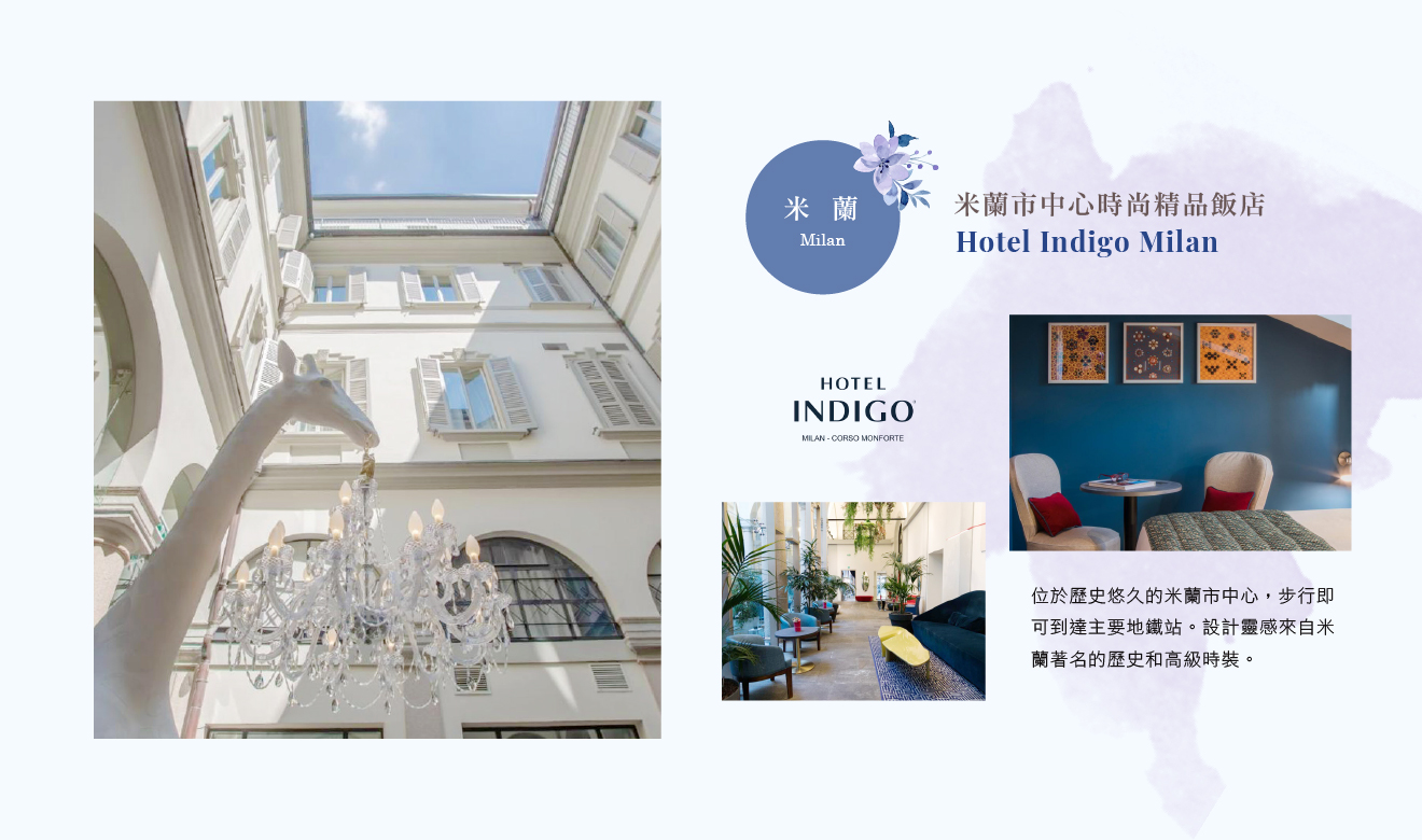 住宿:NH Collection Milano President 或 Rosa Grand Milano Starhotels Collezione 或 The Square Milano Duomo 或同等級
