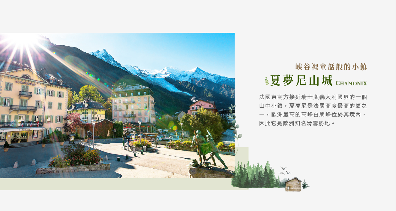 隨後來到位於法國東部邊境的隆河阿爾卑斯省,此地是法國特殊景觀的縮影,也是法國大自然色彩最豐富的地區,清澈的湖泊、迷人的山城、滿山遍野的綠草地,吸引了無數的遊客造訪;雪與陽光匯集的夏夢尼山城,座落冰河峽谷中風景優美如童話般的小鎮,是歐洲著名的避暑勝地和滑雪中心,亦是前往歐陸第一高峰4807公尺白朗峰的衛星城鎮,小鎮上全年無休,除山區特產店外,徒步登山的路線也很多。我們搭乘二段★大纜車,登上標高3,842公尺的南針峰,天氣好的話,隨著纜車逐級攀高,視野亦隨之擴大,抵頂後,★特別搭乘電梯至觀景台遠眺阿爾卑斯山群峰;若您膽子夠大可以另外體驗2013.12.21全新開幕的『步步驚心空中玻璃看台Step into the Void 』(須視安全及維修狀況而開放),是一個五面玻璃結構的懸空看台,可以觀看白朗峰群的壯麗全景,而懸空看台腳下就是達數千米的深谷,站立其上相當的驚險刺激。隨後輕鬆於小城內的商家購物逛街、也可於廣場上的露天咖啡廳品杯香醇法式咖啡,一臉滿足地盡擁美麗時光。
