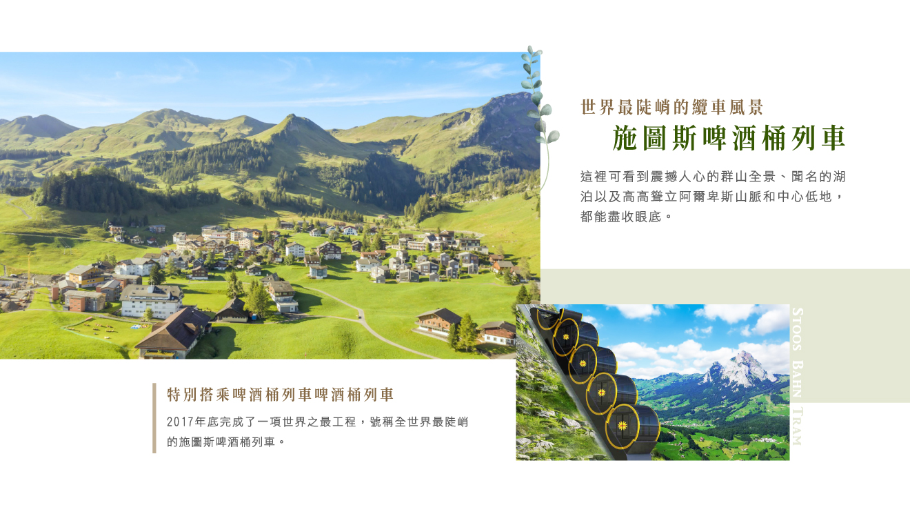 ■施圖斯,位於Fronalpstock山腳下一片風景宜人的地方,那裏是和它同名海拔約1300米的高原,在這裏將看到震撼人心的群山全景、聞名的湖泊以及高高聳立阿爾卑斯山脈和中心低地,都能盡收眼底,在這堪稱世界絕景的村子,2017年底完成了一項世界之最工程,號稱全世界最陡峭的★施圖斯啤酒桶列車正式啟用,軌道全長1720公尺,短短不到2公里的距離,高度差卻有743公尺,爬升角度高達47.7度,傾斜程度可說是直比雲霄飛車,新的列車樣似啤酒桶,以鑲黃滾邊與黑色造型亮相,現代感十足的設計,於山區行進中相當顯眼,包含圓筒狀的車廂,每列有4個車廂,每個車廂能夠容納34名乘客,每趟旅程能夠乘載136名乘客,大大提高了運載力,也是鐵路工程的一大壯舉,更被譽為當代運輸工程的勝利。