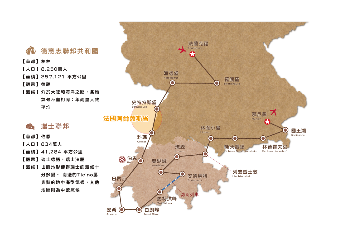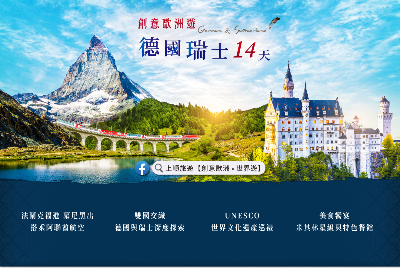 2026/02/11(三) | 桃園國際機場出發 創意德國瑞士~阿爾薩斯巴登巴登溫泉鄉冰河列車愛的迫降新天鵝堡國王湖三大名峰14天機位 29 候補0 已售0 可售28★冰河列車一等艙★阿聯酋航空EK晚班機回、北進南出單一路線 |