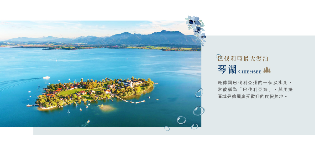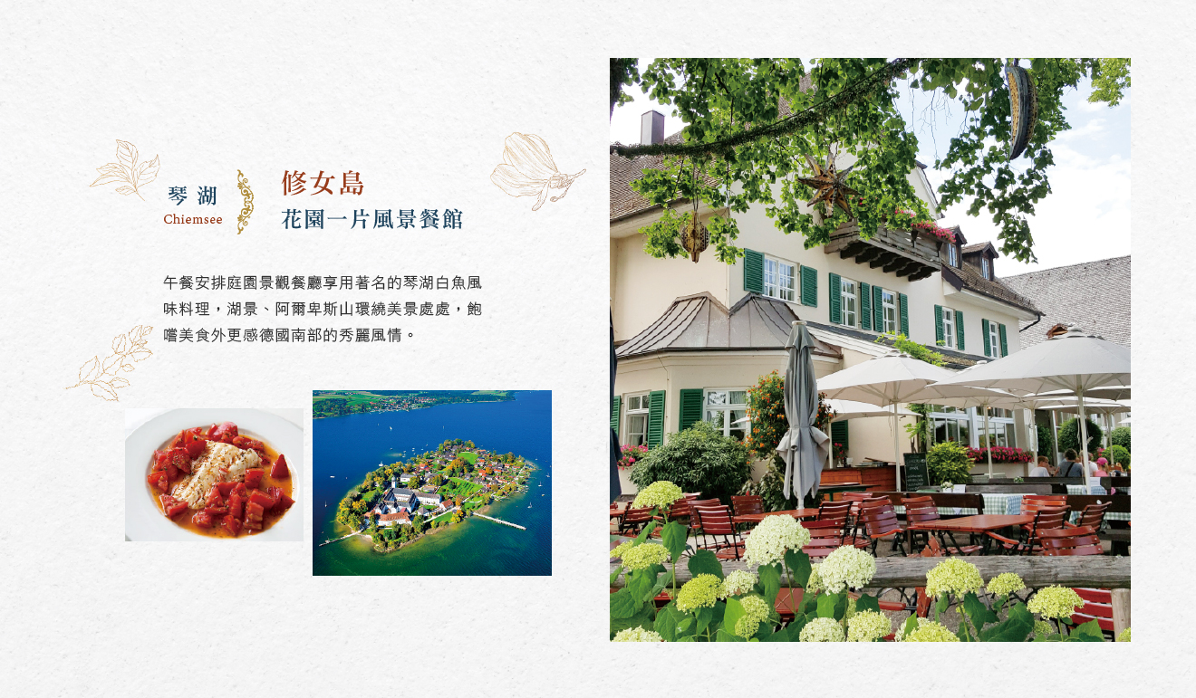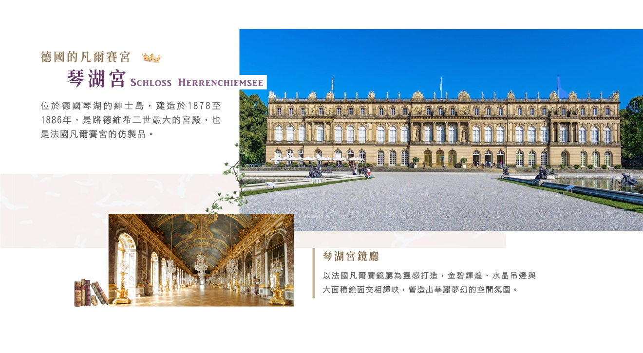 ◆琴湖(Herren Chiemsee)集阿爾卑斯山源流,是巴伐利亞第一大湖。於碼頭搭乘遊船前往■修士島,下船後,徒步穿過森林小徑(約莫20分鐘),抵浪漫國王路易二世( Ludwig II) 以法國凡爾賽宮為範本,但鏡廳(結合橘園之規模,比前者更大)所興建之宮殿。正殿入口即以希臘藝術諸神標示國王對藝術的重視;藍色寢廳則反映出巴伐利亞王室的代表色;舉世無雙的花瓷吊燈,來自德國第一品牌Meissen瓷器廠;而「魔術餐桌」之巧思更充分反映出這位「做夢國王」未泯之童心和重藝輕武的「治國之道」。 ★路德維文物館,最值得看的是歌劇場景模型、太陽王嘉言瓷器組、洛可可雕花寢俱等。