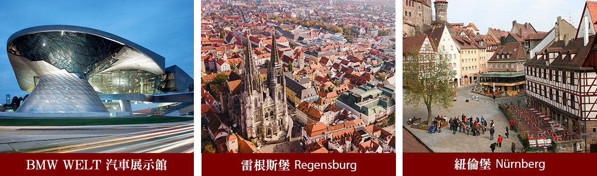 ■紐倫堡,神聖羅馬帝國皇帝前後約八百年的登基之城,也是希特勒1930年代舉行納粹黨員大會的地方,而德國浪漫派音樂大師華格納的「紐倫堡名歌手」一劇亦是以這裏作為故事的背景地,另外德國文藝復興時期最為人讚佩的畫家杜勒也生於這裏。徒步遊舊城的中央廣場大市集(每年11月中旬至12月以聖誕市集著稱)、美之泉(幸運之環)、聖母院……等,隨即漫步至■高堡區,1050年由亨利3世下令築城,亦為歷任選帝侯的王城,登高一賞媲美義大利翡冷翠的全城景觀。