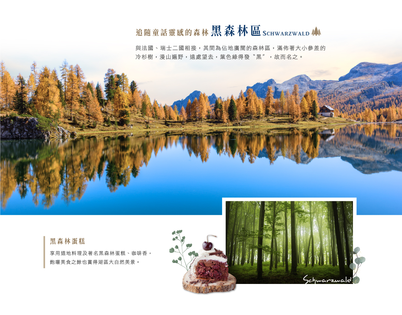 ■黑森林區,位於德國西南邊陲地區,與法國、瑞士二國相接,南北長達160 公里、東西寬為20~55公里,其間為佔地廣闊的森林區,滿佈著大小參差的冷杉樹,漫山遍野,遠處望去,葉色綠得發「黑」,故而名之!森林中,河溪清流、野生動物四處奔晷;春、夏季節,百花齊放、樹林繁茂,秋、冬季節,滿山楓紅、白雪覆蓋一片大地,渾然天成美景喜不勝收!
