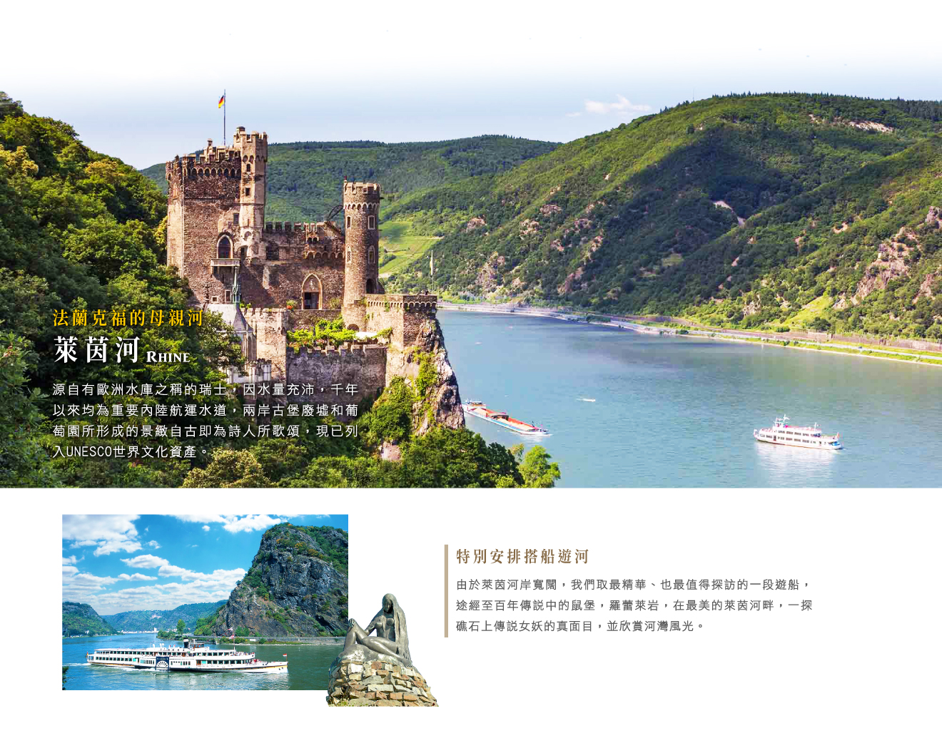 ■萊茵河畔,源自有歐洲水庫之稱的瑞士,因水量充沛,千年以來均為重要內陸航運水道,兩岸古堡廢墟和葡萄園所形成的景緻自古即為詩人所歌頌,現已列入UNESCO世界文化資產,搭配遊船時間搭船遊河,由於萊茵河岸寬闊,我們取最精華、也最值得探訪的一段遊船,途經至百年傳說中的鼠堡,羅蕾萊岩,在最美的萊茵河畔,一探礁石上傳說女妖的真面目,並欣賞河灣風光。