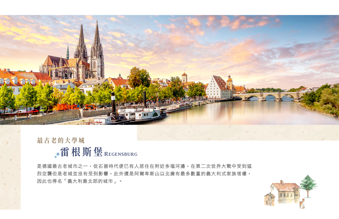 ■雷根斯堡,位於多瑙河與雷根河的交匯處,是德國最古老城市之一,從石器時代便已有人居住在附近多瑙河邊,在第二次世界大戰中受到猛烈空襲但是老城並沒有受到影響,此外還是阿爾卑斯山以北擁有最多數量的義大利式家族塔樓,因此也得名「義大利最北部的城市」,古城內有超過一千座歷史建築受到保護,進入古城前的石橋和橋門建築於1135年至1146年間,是中世紀最重要的橋梁建築之一,也成為12世紀到13世紀許多大型石頭橋梁的範例,主教座堂是巴伐利亞南部哥德式建築主要代表也是主教駐地,曾經兩次被大火燒毀後於1273年重建,2006年雷根斯堡老城入選世界文化遺產。