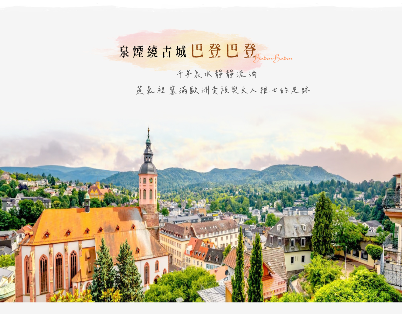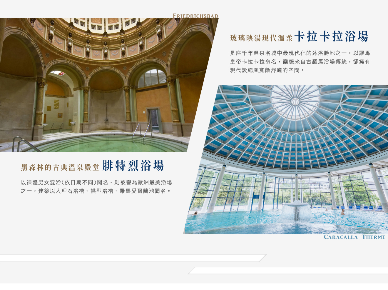 ■巴登巴登,自古即以溫泉浴池而聞名,雖然羅馬人很早在這裏發現了溫泉,不過此城要等到拿破崙在此建立巴登候國才躍昇成歐洲貴族的渡假中心,馬克吐溫在他的德國遊紀中曾提到,永遠留在巴登巴登的東西~他的風濕症;此地二大著名溫泉浴場~腓特烈浴場(14歲以下無法入內)以裸體男女混浴聞名(周一.二.六分浴;其餘日期及節假日、2月14日為混浴),則被譽為歐洲最美浴場之一,建築以大理石浴槽、拱型浴槽、羅馬愛爾蘭池聞名;另一卡拉卡拉溫泉浴場(7歲以下無法入內),為現代建築風格,需穿著泳衣、無需泳帽。