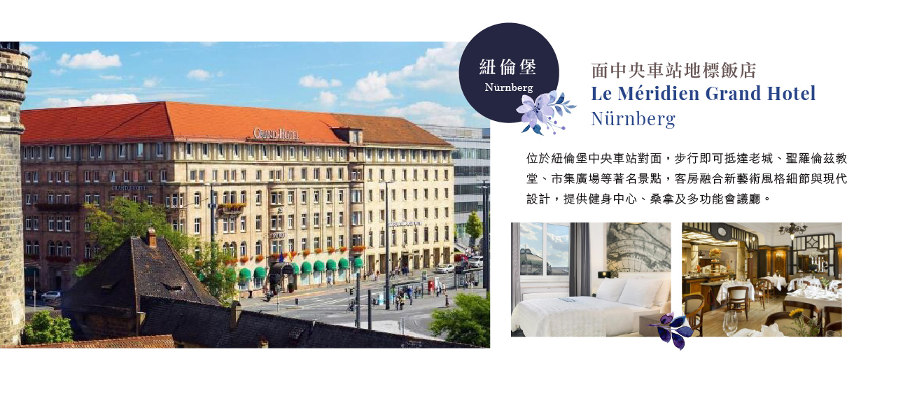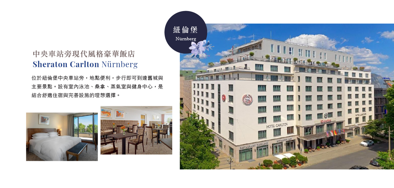 住宿:Sheraton Carlton 或 紐倫堡Le Meridien Grand 或同等級
