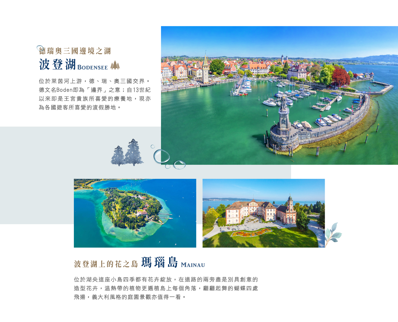 ■波登湖,位於萊茵河上游,德、瑞、奧三國交界。德文名Boden 即為「邊界」之意;自13 世紀以來即是王宮貴族所喜愛的療養地,現亦為各國遊客所喜愛的渡假勝地。