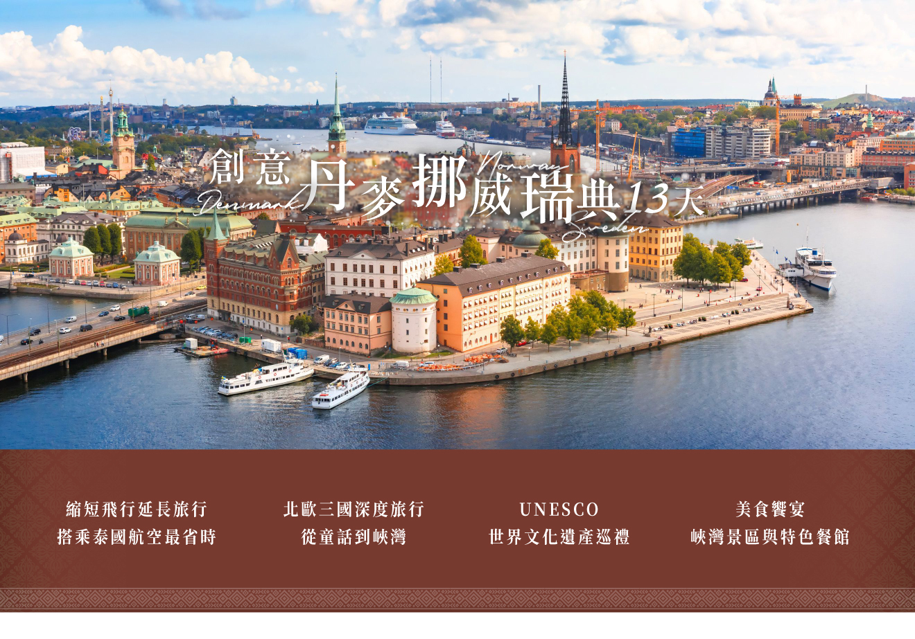 2026/05/19(二) | 桃園國際機場出發 創意北歐 丹麥.挪威.瑞典三國DFDS渡輪孟克吶喊水彩峽灣縮影火車北大西洋大道13天機位 29 候補0 已售0 可售28泰國航空TG貝爾根.斯德哥爾摩皆宿2晚豪華團 |