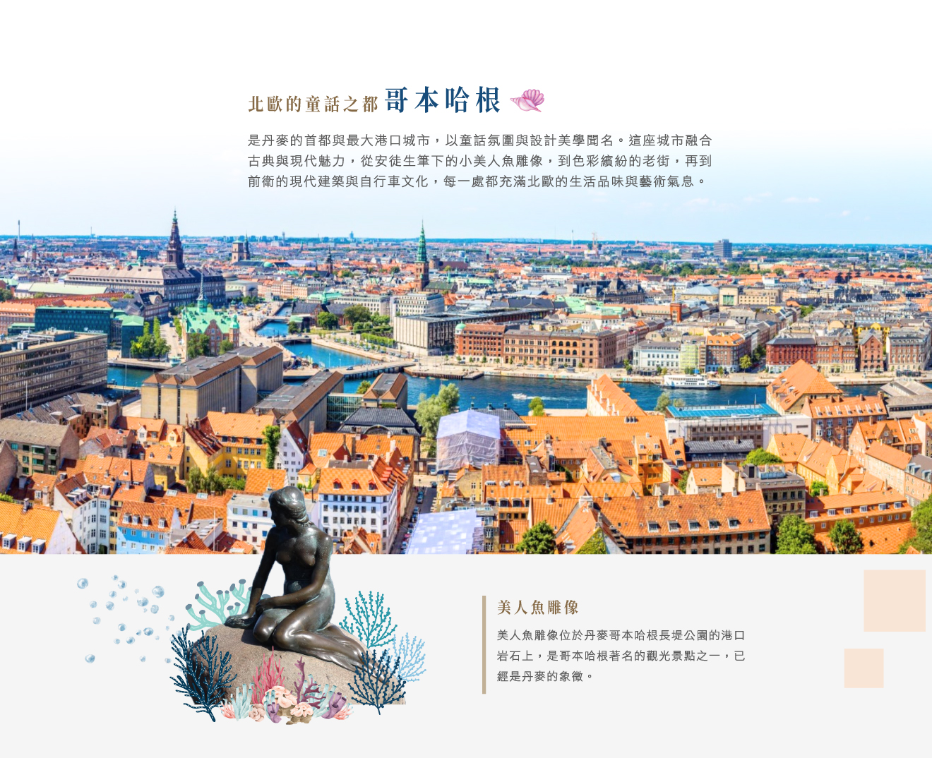 ■哥本哈根,展開市區觀光,舊城廓、皇宮廣場和以安徒生童話聞名的美人魚雕像,及展現北歐神話中強而有力之女神像卡菲茵噴泉。
